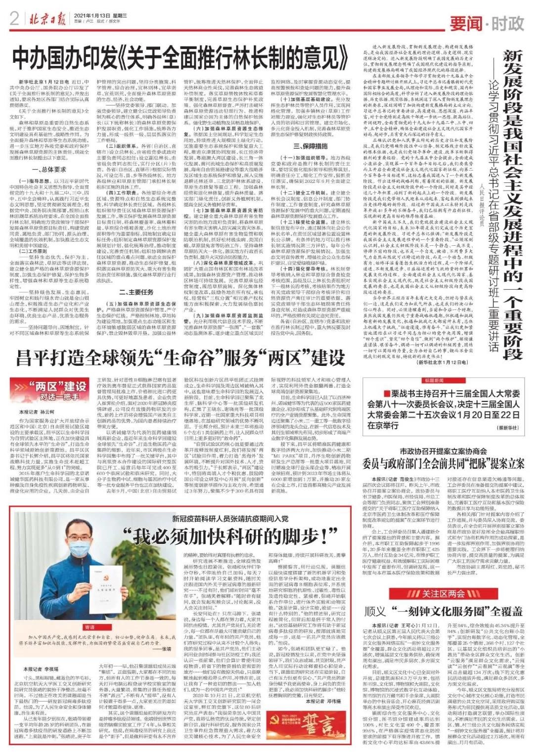 《北京日报》要闻版2021年1月13日报道我校医工交叉创新研究院生物医学工程高精尖中心研究员张靖抗疫期间入党事迹