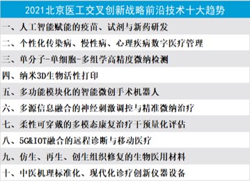 本届“医工谷”论坛结合我国实际临床需求,借鉴学术界、产业界和投资界的相关意见,从技术、临床、产业三个纬度凝练共识,评选出“2021北京医工交叉创新战略前沿技术十大趋势”: