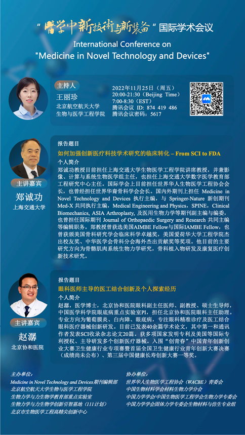 本次会议由Medicine in Novel Technology and Devices期刊编辑部、北京欧美大片ppt免费大全生物与医学工程学院、生物力学与力生物学教育部重点实验室、生物力学与力生物学创新引智基地(111计划)、北京市生物医学工程高精尖创新中心主办,由世界华人生物医学工程协会(WACBE)青委会、中国生物材料学会材料生物力学分会、中国力学学会/中国生物医学工程学会生物力学专委会、中国力学学会固体力学专委会生物材料与仿生专业组协办,医学中新技术与新装备国际学术会议将于2022年11月-12月以线上方式举办。