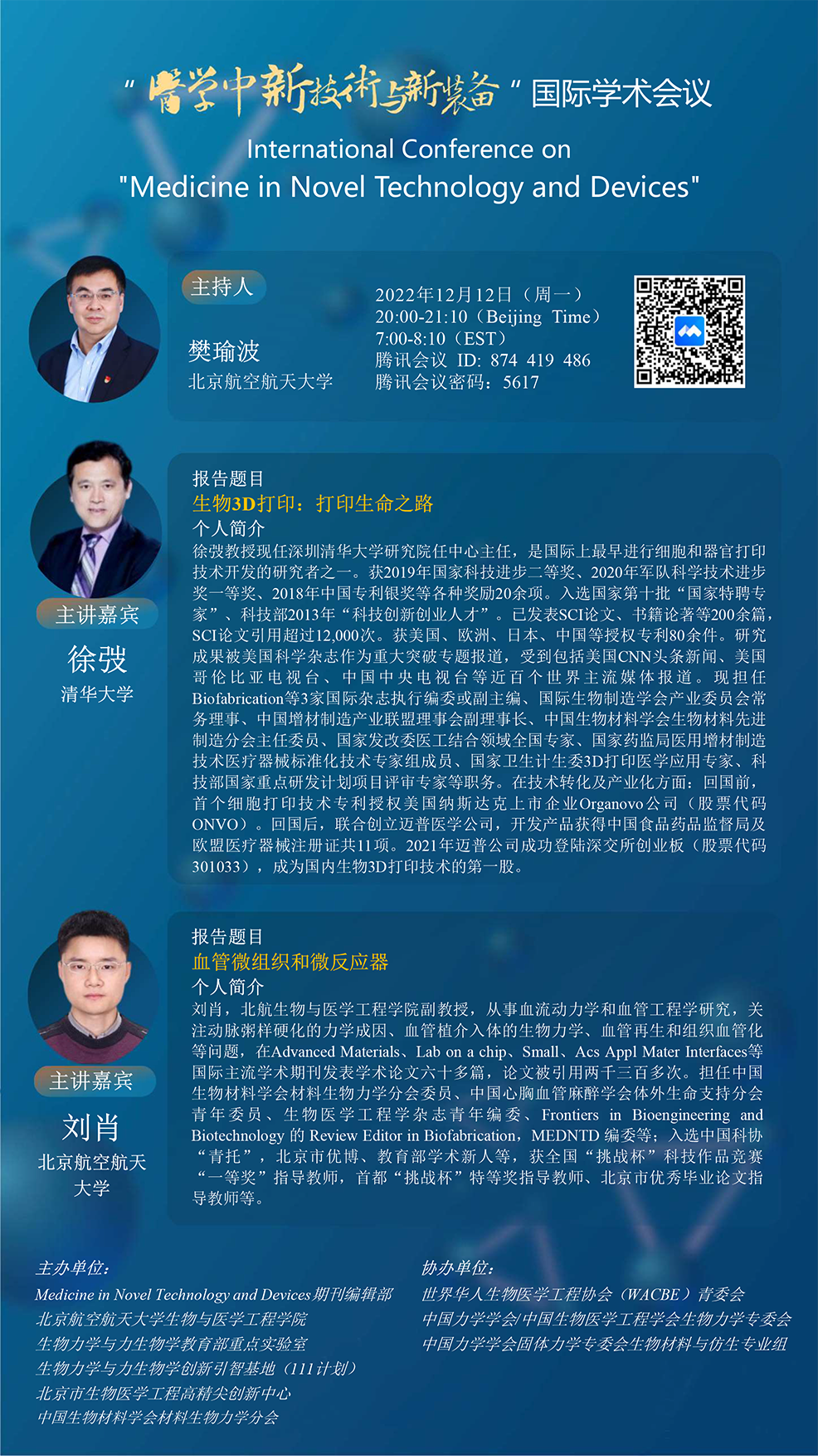 本次会议由Medicine in Novel Technology and Devices期刊编辑部、北京欧美大片ppt免费大全生物与医学工程学院、生物力学与力生物学教育部重点实验室、生物力学与力生物学创新引智基地(111计划)、北京市生物医学工程高精尖创新中心、中国生物材料学会材料生物力学分会主办,由世界华人生物医学工程协会(WACBE)青委会、中国力学学会/中国生物医学工程学会生物力学专委会、中国力学学会固体力学专委会生物材料与仿生专业组协办,医学中新技术与新装备国际学术会议将于2022年11月-12月以线上方式举办。