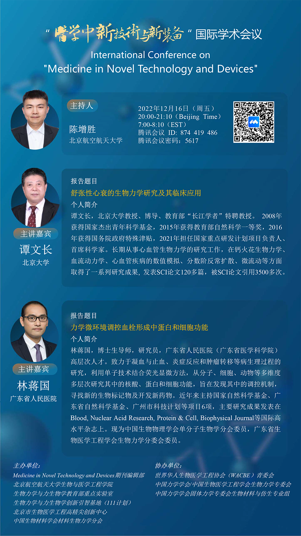 本次会议由Medicine in Novel Technology and Devices期刊编辑部、北京欧美大片ppt免费大全生物与医学工程学院、生物力学与力生物学教育部重点实验室、生物力学与力生物学创新引智基地(111计划)、北京市生物医学工程高精尖创新中心、中国生物材料学会材料生物力学分会主办,由世界华人生物医学工程协会(WACBE)青委会、中国力学学会/中国生物医学工程学会生物力学专委会、中国力学学会固体力学专委会生物材料与仿生专业组协办,医学中新技术与新装备国际学术会议将于2022年11月-12月以线上方式举办。