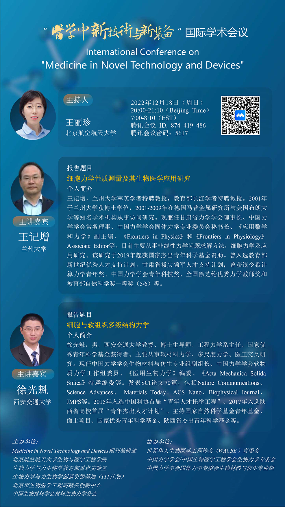 本次会议由Medicine in Novel Technology and Devices期刊编辑部、北京欧美大片ppt免费大全生物与医学工程学院、生物力学与力生物学教育部重点实验室、生物力学与力生物学创新引智基地(111计划)、北京市生物医学工程高精尖创新中心、中国生物材料学会材料生物力学分会主办,由世界华人生物医学工程协会(WACBE)青委会、中国力学学会/中国生物医学工程学会生物力学专委会、中国力学学会固体力学专委会生物材料与仿生专业组协办,医学中新技术与新装备国际学术会议将于2022年11月-12月以线上方式举办。