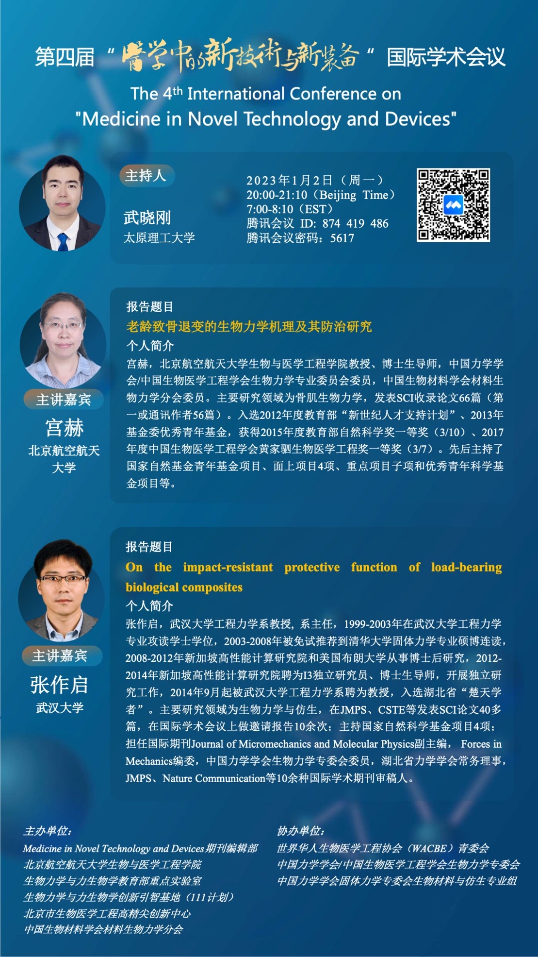 本次会议由Medicine in Novel Technology and Devices期刊编辑部、北京欧美大片ppt免费大全生物与医学工程学院、生物力学与力生物学教育部重点实验室、生物力学与力生物学创新引智基地(111计划)、北京市生物医学工程高精尖创新中心、中国生物材料学会材料生物力学分会主办,由世界华人生物医学工程协会(WACBE)青委会、中国力学学会/中国生物医学工程学会生物力学专委会、中国力学学会固体力学专委会生物材料与仿生专业组协办,医学中新技术与新装备国际学术会议将于2023年1月以线上方式举办。