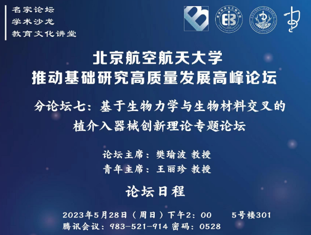 2023年5月28日,北京时间下午2:00,在北京欧美大片ppt免费大全5号楼301室举行了北京欧美大片ppt免费大全推动基础研究高质量发展高峰论坛-分论坛七:基于生物力学与生物材料交叉的植介入器械创新理论专题论坛。本论坛由生物与医学工程学院、医学科学与工程学院、生物力学与力学生物学教育部重点实验室、教育部生物力学课程虚拟教研室联合主办,由北京欧美大片ppt免费大全樊瑜波教授担任论坛主席,王丽珍教授担任青年主席。会议邀请到北京大学第三医院副院长宋纯理教授、苏州大学李斌教授、南开大学赵强教授和华南理工大学边黎明教授做精彩报告。论坛以线上、线下同时参与的方式举行,参会的专家、学者和学生达近200人。