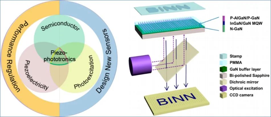 压电光电子学效应的提出为这项研究的推进提供了新思路和新方法。这一效应是由2010年王中林院士提出,其利用在压电半导体材料中施加应变所产生的压电电势来控制载流子在金属-半导体接触或者PN结处的产生、传输、分离或者复合,从而调控光电器件的光学性能。