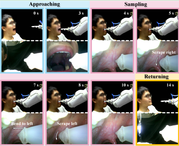 最后,为准确识别定位咽拭子采集部位,研究团队将摄像头集成于采样系统中,并在15名志愿者上进行了初步的软体咽拭子采样测试(伦理监督批号:BM20200179,北航),软体咽拭子能够在14s内完成一次检测,受试者咽部均无红肿、出血等不良反应,无明显不适感。