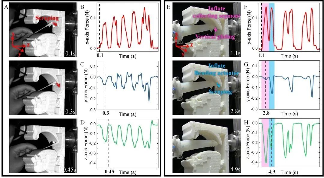 通过利用高速相机、六轴力传感器对专业医生采集咽拭子样本时的手部动作进行分析及力采集,研究团队发现医生在采样过程中,其操作一般结合了单一方向的划动,扭转等动作,所施加力约为1N。通过模仿这一采样动作,课题组从章鱼触手的运动中获得灵感,设计出具有伸长/扭转、弯曲功能的软体咽拭子机器人样机,端部的软体折纸结构能够伸长/扭转运动,实现拭子在喉壁的刮擦动作,根部的锥形结构则能够实现弯曲运动来扩大拭子的取样范围,并抵抗受试者舌部的干扰。