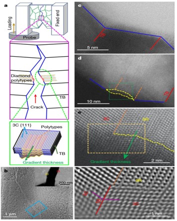 作为自然界中最坚硬的金刚石,虽然有着广泛的应用前景,但是与其无与伦比的硬度相比,其固有的脆性就如同“阿喀琉斯之踵”一样极大地限制了它的应用。如何协同提高其硬度和韧性一直是材料科学研究面临的重要挑战之一。纳米孪晶化已经被证明可以有效地提高金刚石的硬度(Nature,2014, 510, 250),改变制备条件引入非3C相金刚石多型结构(如2H, 4H, 9R, 15R等)将有望进一步提高其韧性。从原子尺度理解其强韧化作用机制有利于设计新型超硬、超韧金刚石,而且对于发展性能更加优越的超硬材料和工程陶瓷将起到积极的指导作用。