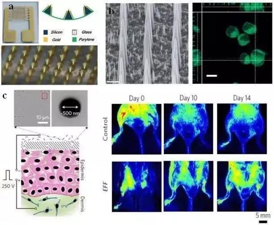 图3 单细胞精度的在体基因转染芯片。(a)一种可以直接贴皮的聚合物柔性微针阵列可用于在体电穿孔;(b)可降解纳米硅针阵列用于在体核酸递送;(c)硅基纳米通道电穿孔技术用于在体细胞重编程。