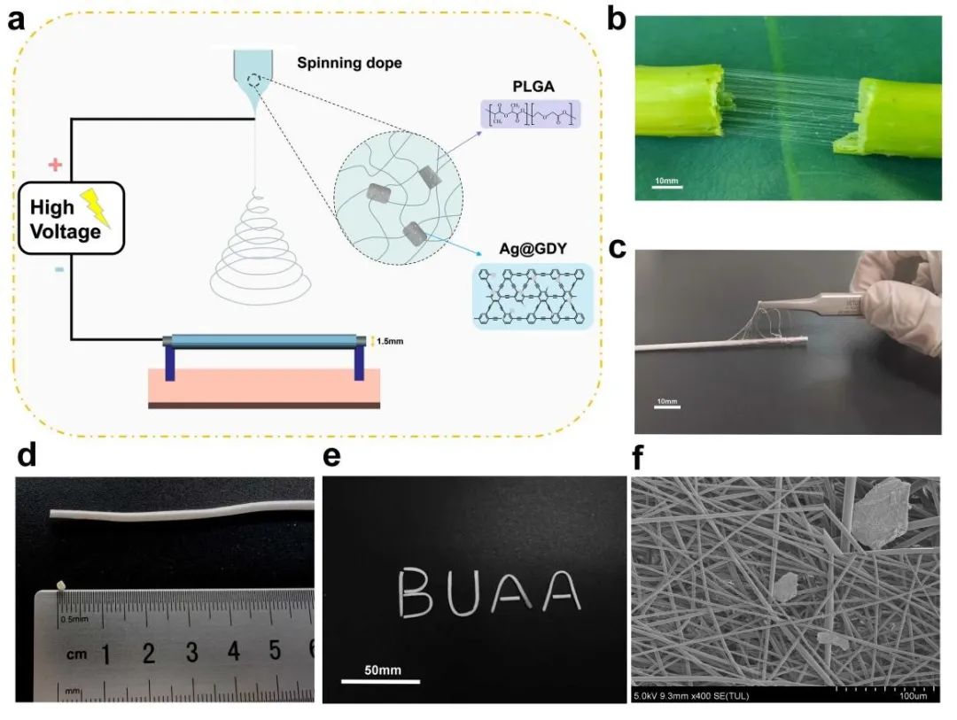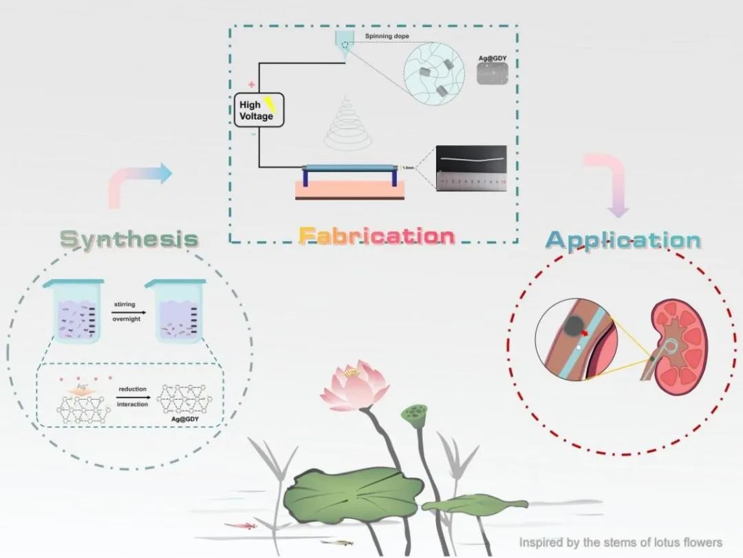 团队前期研究发现石墨炔材料在生物医学工程领域具有独特的生物相容性优势及应用前景(J Haz Mat, 2023, 445:130512, IF=14.224)。近日在此基础上基于二维石墨炔材料设计制备了含Ag@GDY纳米复合材料,借助石墨炔大比表面积的优良特性,将银单质通过原位合成的方式共载合成Ag@GDY纳米复合材料,实现了银单质粒径调控及载附分布达到抑菌效果。提出了仿多丝状莲花茎结构的可降解抗菌支架设计新方法,设计制造出Ag@GDY与可降解基底材料PLGA支架并分析了抑菌性、力学性能及良好生物相容性,展示了临床应用前景。