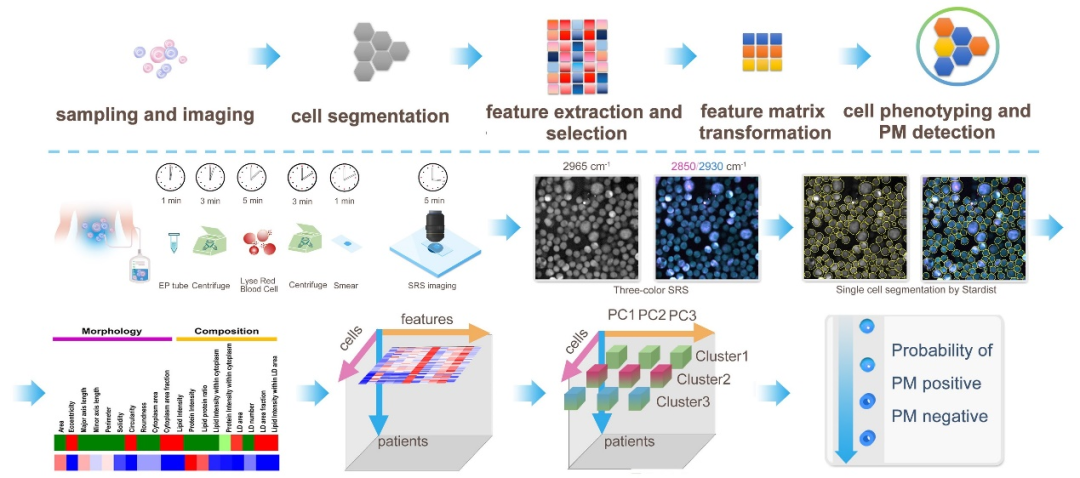 受激拉曼散射显微成像是一类新兴的无需荧光标记的分子成像技术,近年来为肿瘤代谢和诊断的研究提供了有力手段。本研究基于受激拉曼散射的单细胞分子成像,首先采集胃癌腹腔脱落细胞的脂质、蛋白、核酸3个通道的原位图像,再利用深度学习网络实现高精准的单细胞分割,接着提取和筛选在阴性和阳性病例中具有显著差异的12个单细胞形态和成分特征,然后利用PCA降维和K-means聚类方法,识别出脱落细胞中指示阳性和阴性的细胞亚群(significant marker cell cluster),从而实现胃癌腹膜转移的精准诊断。经80个病例(53951个脱落细胞)的实验验证,结果显示,该方法在20分钟内可实现单病例的腹腔脱落细胞检测,腹膜转移的诊断灵敏性和特异性达到81.5%和84.9%,AUC达到0.85。而且,本研究还发现单细胞形态特征主要贡献了诊断特异性,而单细胞成分特征主要贡献了诊断灵敏度,这也就很好地解释了受激拉曼散射分子成像能够显著提高诊断灵敏度的原因。