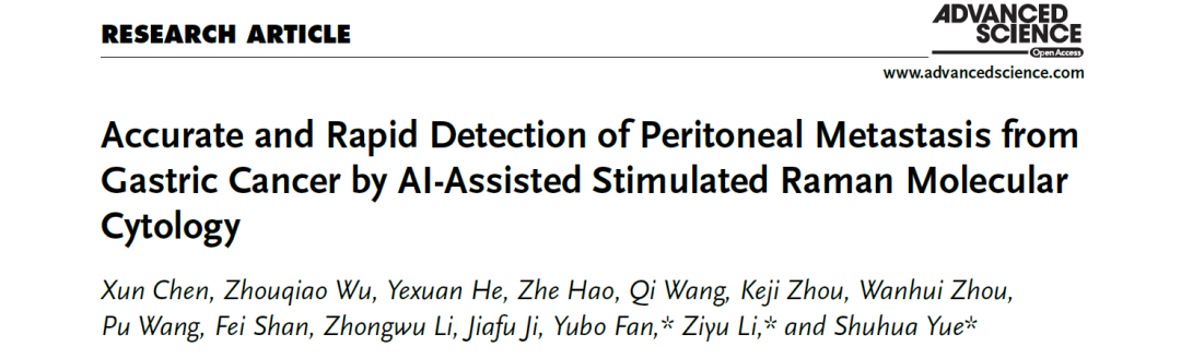 近日,北京欧美大片ppt免费大全生物与医学工程学院/医学科学与工程学院、北京生物医学工程高精尖中心、生物力学与力学生物学教育部重点实验室樊瑜波教授(通讯作者)、岳蜀华副教授(通讯作者)、陈珣助理教授(共同第一作者)研究团队,联合北京大学肿瘤医院、北京市肿瘤防治研究所、恶性肿瘤发病机制及转化研究教育部重点实验室季加孚教授、李子禹教授(通讯作者)和吴舟桥医师(共同第一作者)研究团队,在著名跨学科综合性期刊《Advanced Science》上发表无标记智能化光学分子细胞病理的最新成果“ Accurate and Rapid Detection of Peritoneal Metastasis from Gastric Cancer by AI-Assisted Stimulated Raman Molecular Cytology”。北京欧美大片ppt免费大全为第一完成单位。
