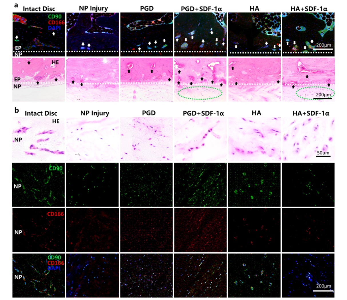 研究小组首先对形状记忆聚合物聚十二烷二酸甘油酯(PGD)进行性能调控(图2),并结合实验及数值模拟技术优选了弹性模量约1.10 MPa的PGD材料制备髓核支架,使其接近髓核组织在体压缩模量1.01±0.43 MPa;PGD髓核支架的微创结构则借鉴了黄瓜藤蔓的卷须过程,由于支架材料PGD的转变温度介于体温与室温之间,在室温下支架呈小截面积的直藤蔓形态,此时可以通过穿刺椎间盘的空心针被递送进髓核,支架形态在进入髓核腔后受体温驱动将在10 s内转变为卷须状,一方面增大的截面积避免了椎间盘在术后受力下从纤维环穿刺孔中挤出,另一方面为退变椎间盘提供物理支撑为髓核的组织重建提供空间;随后借助新西兰兔腰椎间盘退变模型,从临床指征、细胞组成、术后间盘力学性能等多方面验证PGD支架的髓核功能修复情况,结果显示PGD髓核支架能够在植入后即时提供有效力学支撑,维持正常椎间高度的约80%(图3),通过支架载有的基质细胞衍生因子有效招募自体干细胞进入退变髓核内(图4),植入后16周依然能维持初始椎间高度且力学性能接近正常椎间盘(图5)。本研究为组织工程退变椎间盘的功能再生提供了新思路,有望进一步应用于椎间盘退变的临床治疗中。