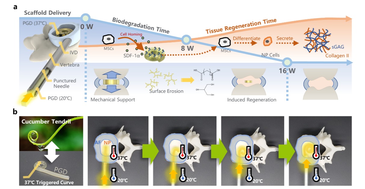 近日,北京欧美大片ppt免费大全生物与医学工程学院生物力学与力生物学教育部重点实验室、北京市生物医学工程高精尖创新中心樊瑜波教授、王丽珍教授团队报道了一种新型微创植入式可降解髓核支架(图1),它能够通过温敏形状记忆聚合物材料实现支架的微创递送,同时提供匹配在体髓核组织的支撑性能,利用支架所搭载的趋化因子实现自体干细胞向退变髓核组织的募集同时抑制椎间盘退变进程。