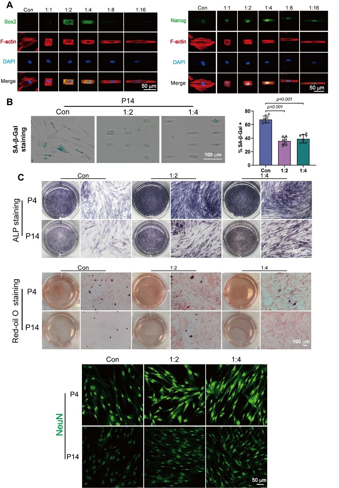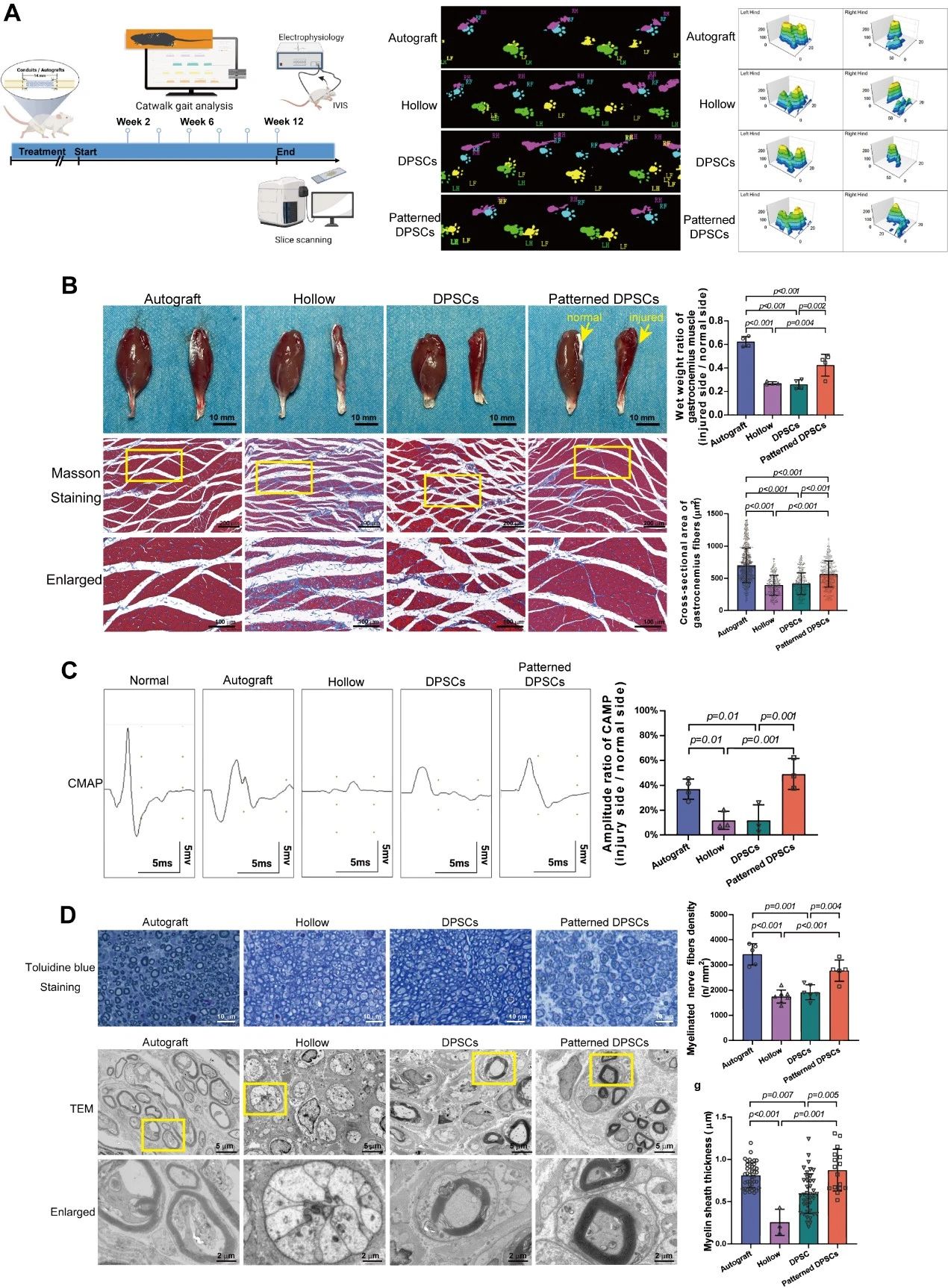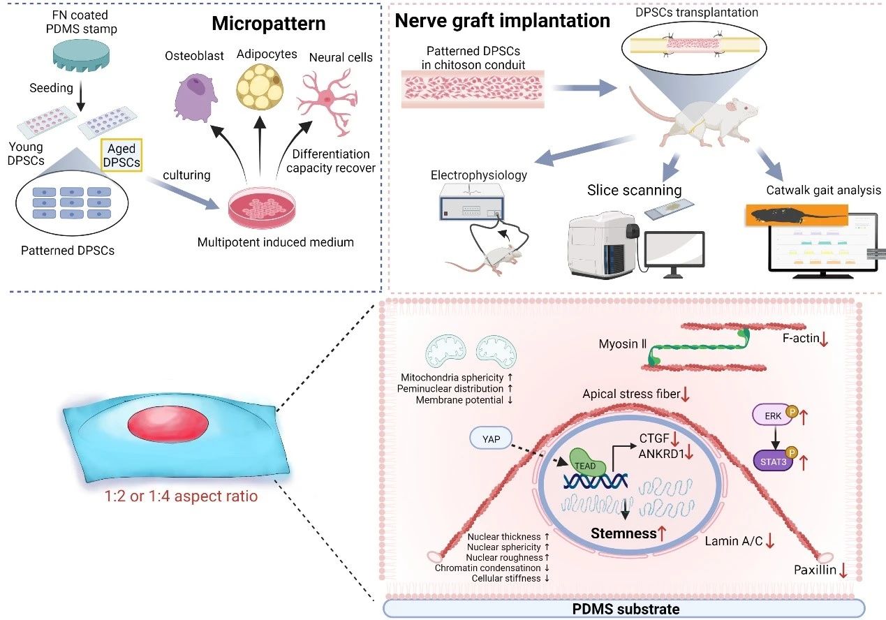 该研究构建了一个基于细胞微图案技术的“干细胞健身房”。研究表明,面积为1024 u㎡、长宽比1:2和1:4矩形微图案上能够增强DPSCs的干性,抑制高代数细胞的衰老并促进其多向分化潜能的恢复(图2)。“干细胞健身房”调控DPSCs细胞核形态,介导表观遗传学和染色质结构的重塑,影响了线粒体的分布及成熟状态(图3)。分子机制研究表明,YAP的出核,STAT3和ERK的磷酸化激活有助于DPSCs维持干性(图4)。通过载体将”干细胞健身房”训练后的DPSCs植入损伤的坐骨神经,手术12周后,经过”干细胞健身房”训练的DPSCs移植组促进了坐骨神经及腓肠肌的再生及功能恢复,更加接近自体移植组临床金标准的水平(图5)。本研究提供了一种通过力学因素促进牙髓干细胞干性维持的新思路,有望进一步应用于干细胞治疗的相关领域。