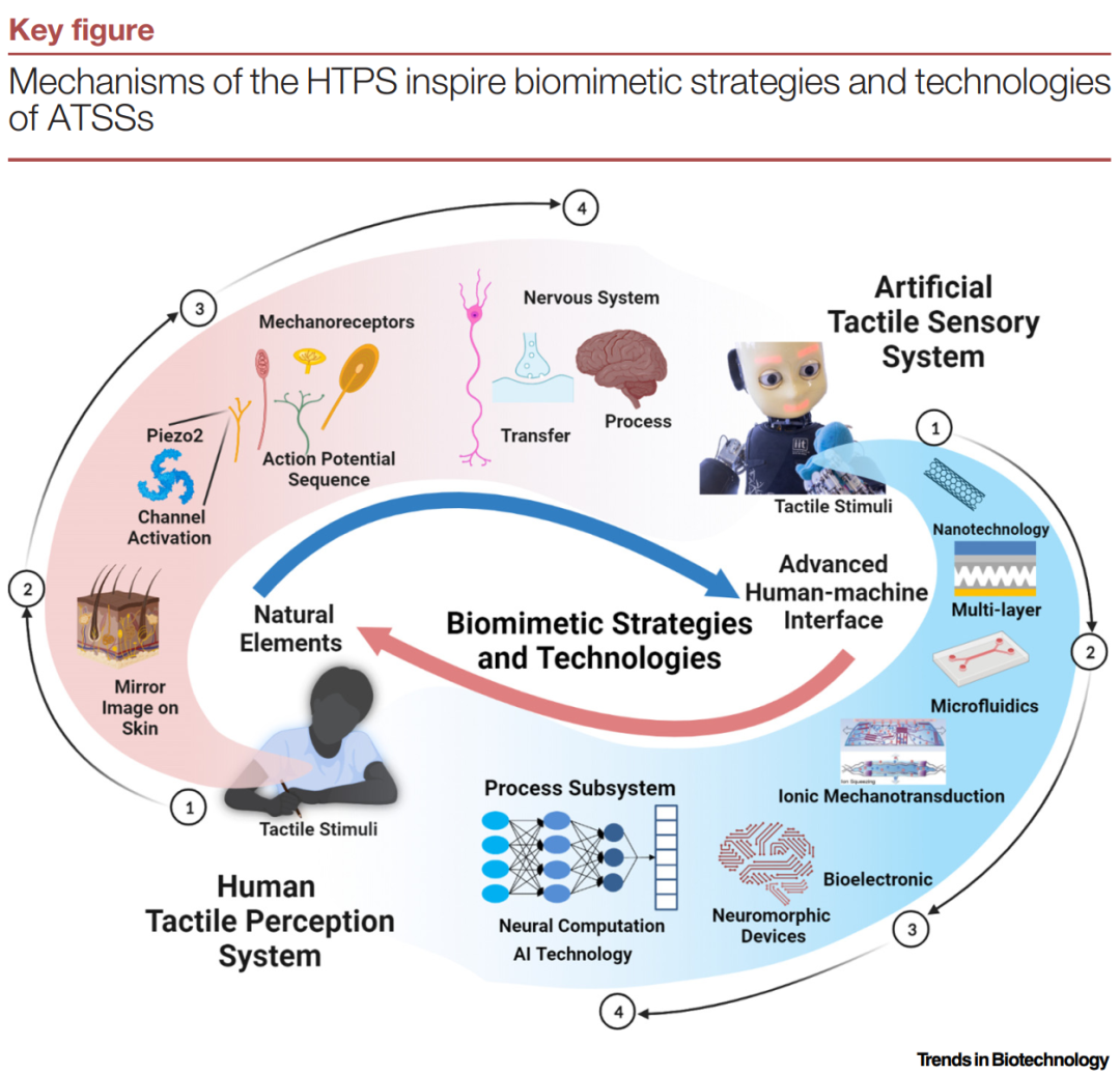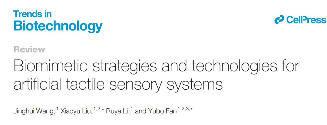 近日,北京欧美大片ppt免费大全生物与医学工程学院、医学科学与工程学院、北京生物医学工程高精尖中心、生物力学与力学生物学教育部重点实验室、虚拟现实技术与系统国家重点实验室的樊瑜波教授(通讯作者)、刘笑宇副教授(通讯作者)、李儒雅副教授和王景辉博士研究生(第一作者)在顶级生物技术期刊Trends in Biotechnology (CELL子刊,IF:21.942)刊发了题为Biomimetic strategies and technologies for artificial tactile sensory systems的封面综述文章。该综述首次将人类触觉感知系统和人造触觉感知系统进行了从触觉信号的获取、传输再到解码的多层次深入对比,系统性的回顾了近年来生物领域内对人类触觉感知系统的重大发现和这些重大发现对人造触觉感知系统的启发性成果。