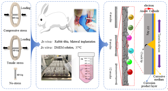 该研究创新了在体加载装置并首次定量分析了拉应力和压应力对高纯镁在体内骨环境中降解行为,探索了高纯镁周围骨组织重建与再生状况。
