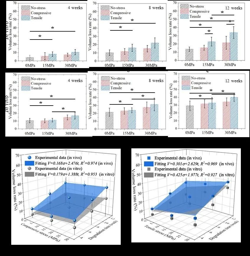 拉应力会增加高纯镁在体内和体外的体积损失速率,相比于体外环境,高纯镁在体内的降解对应力因素更为敏感,但这种敏感性随着腐蚀时间的增加而减弱。高纯镁的体积损失速率与施加的应力和降解时间呈多元线性关系。与应力组相比,无应力组中高纯镁周围骨组织的体积较大,并且随着植入时间的增加而更为显著。以上结果可为优化设计高纯镁基骨植入体以实现植入体降解速率和周围骨组织再生速率之间的平衡提供重要参考,服务于我国骨科植入医疗器械自主创新。