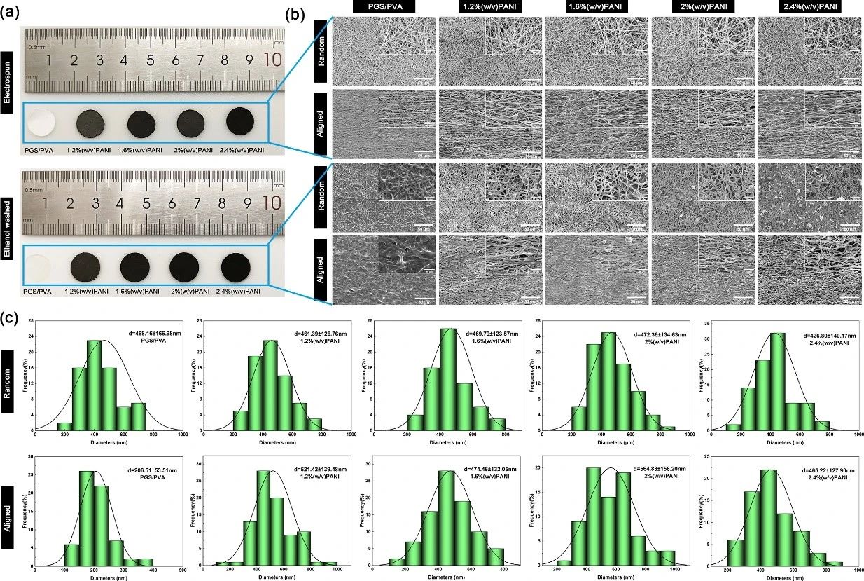 本研究通过引入载体高分子PVA和导电颗粒PANI调控聚合物配比,不仅具有良好的弹性和生物相容性,而且能促进心肌细胞的粘附,迁移和增殖。各向异性的纤维支架能更好的仿生天然心肌的功能,显著促进了H9c2细胞的伸长和排列。研究发现导电纳米颗粒的加入不仅提高了该纤维组织工程支架的导电性能和力学性能,而且减缓了PGS纤维支架的降解速率。