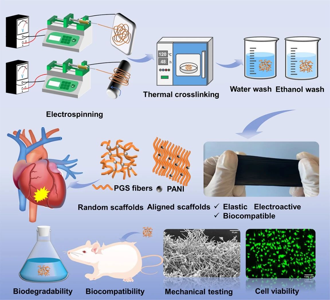 聚癸二酸丙三醇酯(PGS)是一种生物相容性良好的,具有可调降解性能和力学性能的优异弹性体热固性材料。北京欧美大片ppt免费大全樊瑜波教授/王丽珍教授团队探索了合成参数对PGS性能影响及不同牵张应力下降解动力学行为,针对心肌修复需要电活性生物材料治疗心肌梗死的目标,基于PGS材料性能调控方法开发了一种新型的力−电性能可调的具有各向异性的组织工程心肌纤维支架,弹性模量与人类心肌弹性模量(0.02 ~ 0.5 MPa)相近。成果于9月20日在线发表于生物材料领域著名期刊《Materials Today Bio》(Materials Today Bio, 2023, 23, 100798; IF= 8.2)。